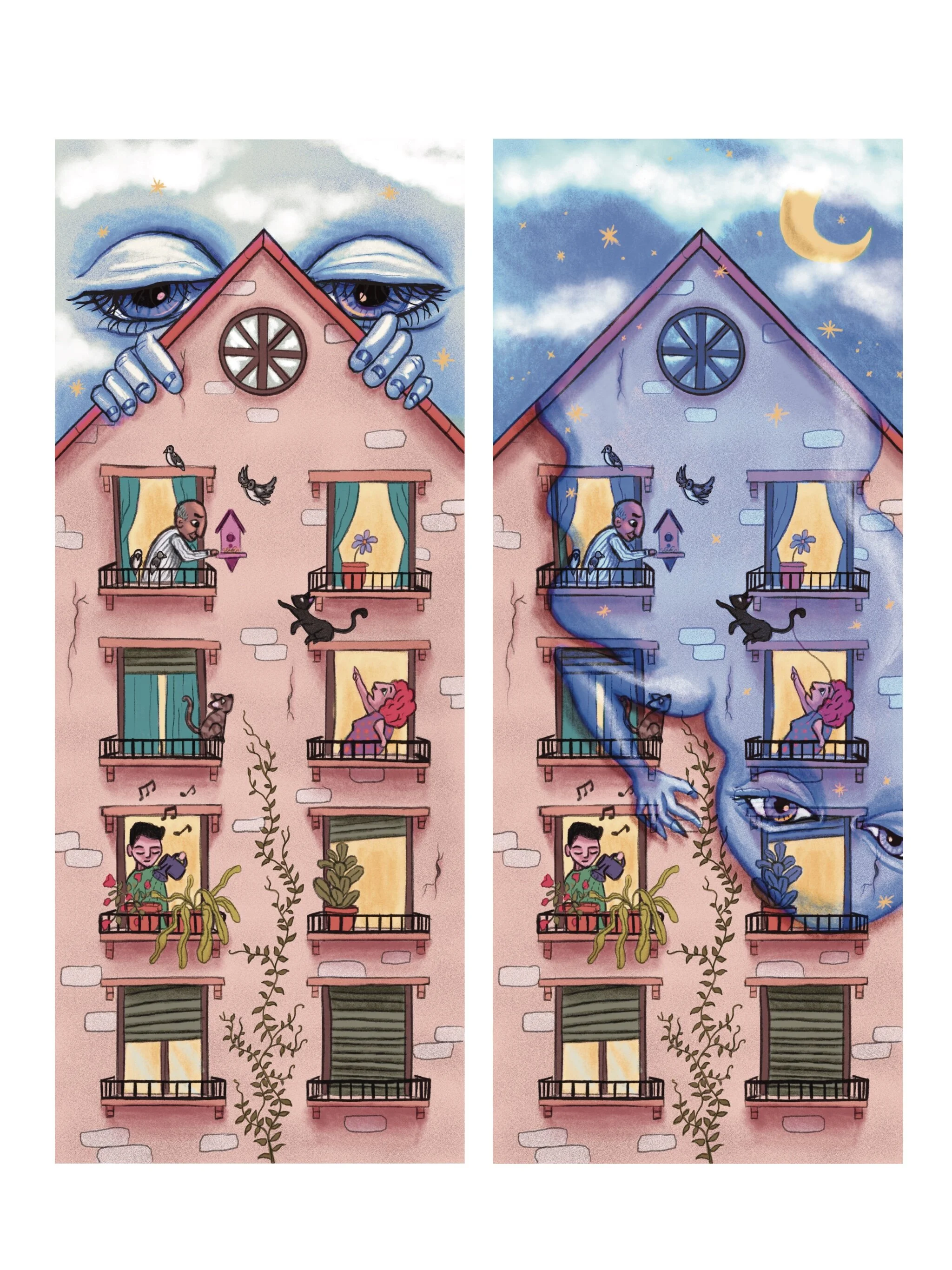 Ilustración narrativa dividida en las dos caras de un marcapáginas, creado como elemento de autopromoción de mi trabajo como ilustradora. Quise crear un marcapáginas ilustrado, en primer lugar, por mi pasión por la lectura y en segundo lugar, como una manera de mostrar mi capacidad para adentrarme en el mercado de la ilustración editorial. (200 unidades impresas en papel reciclado de 300 gr por Impresum)