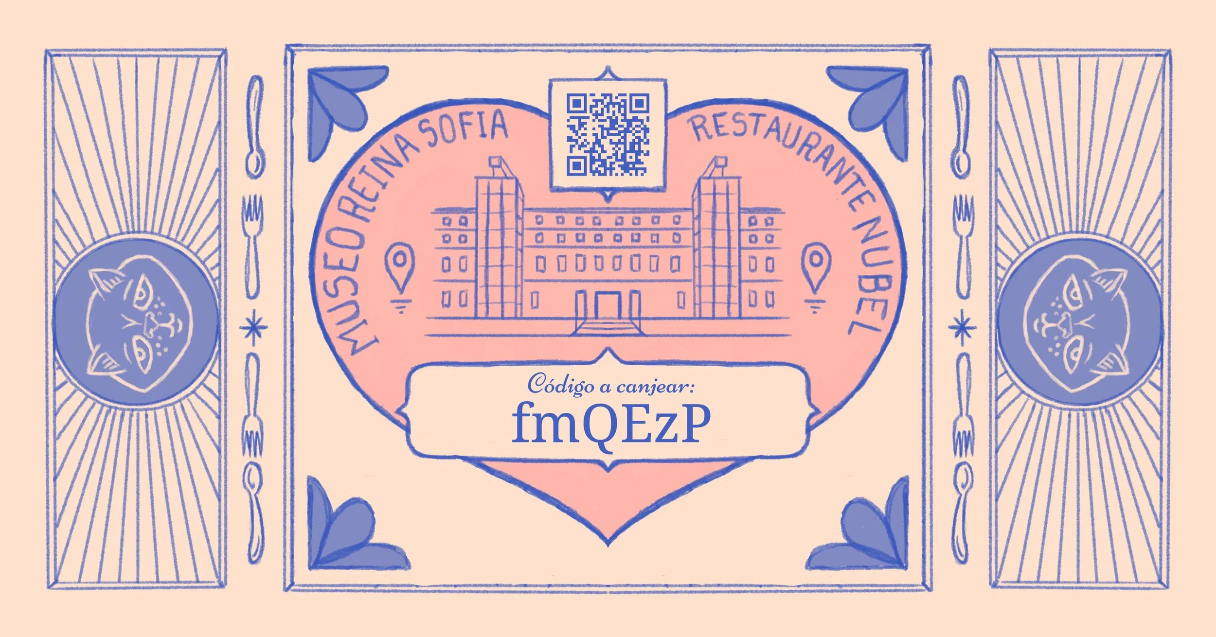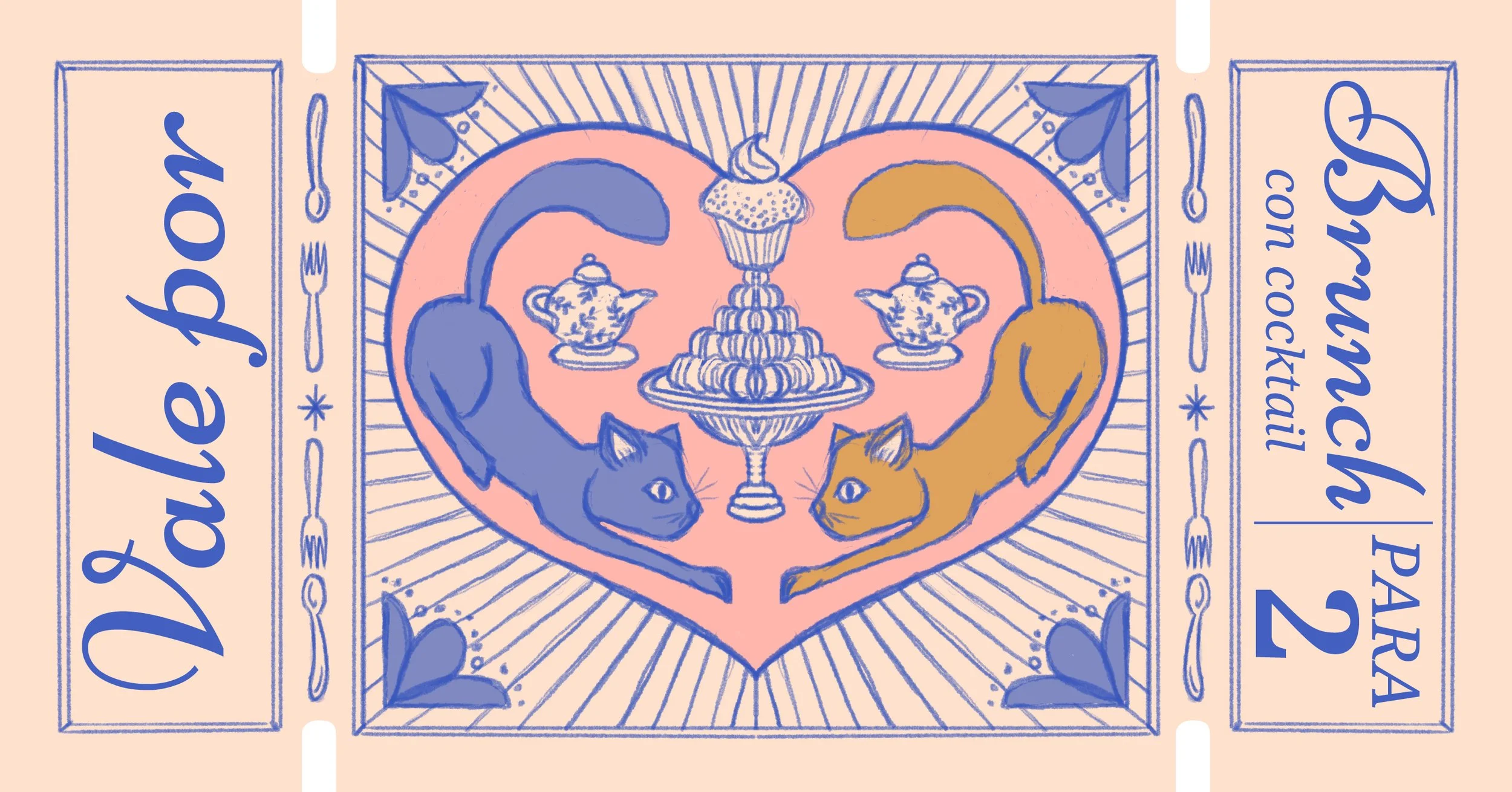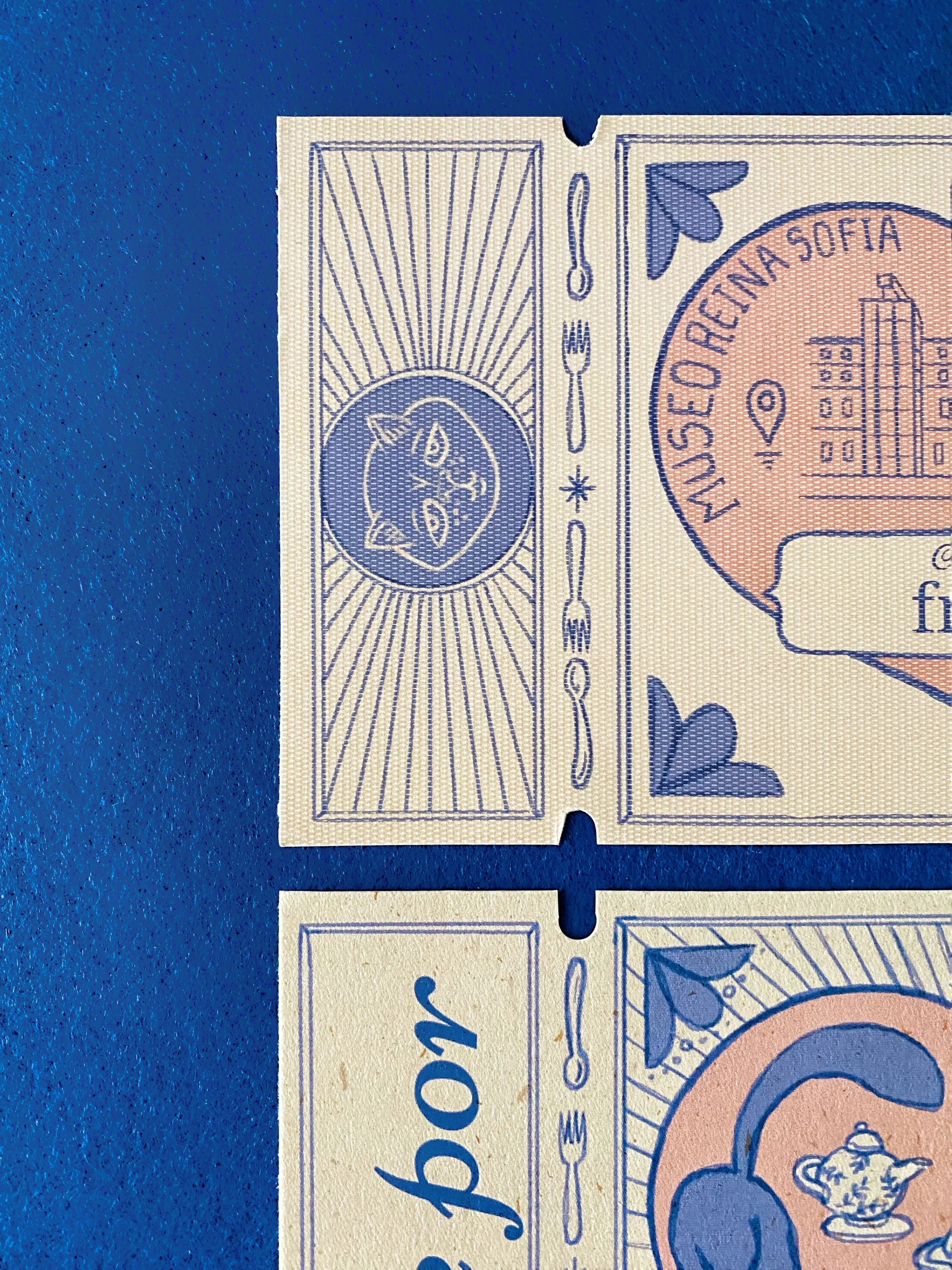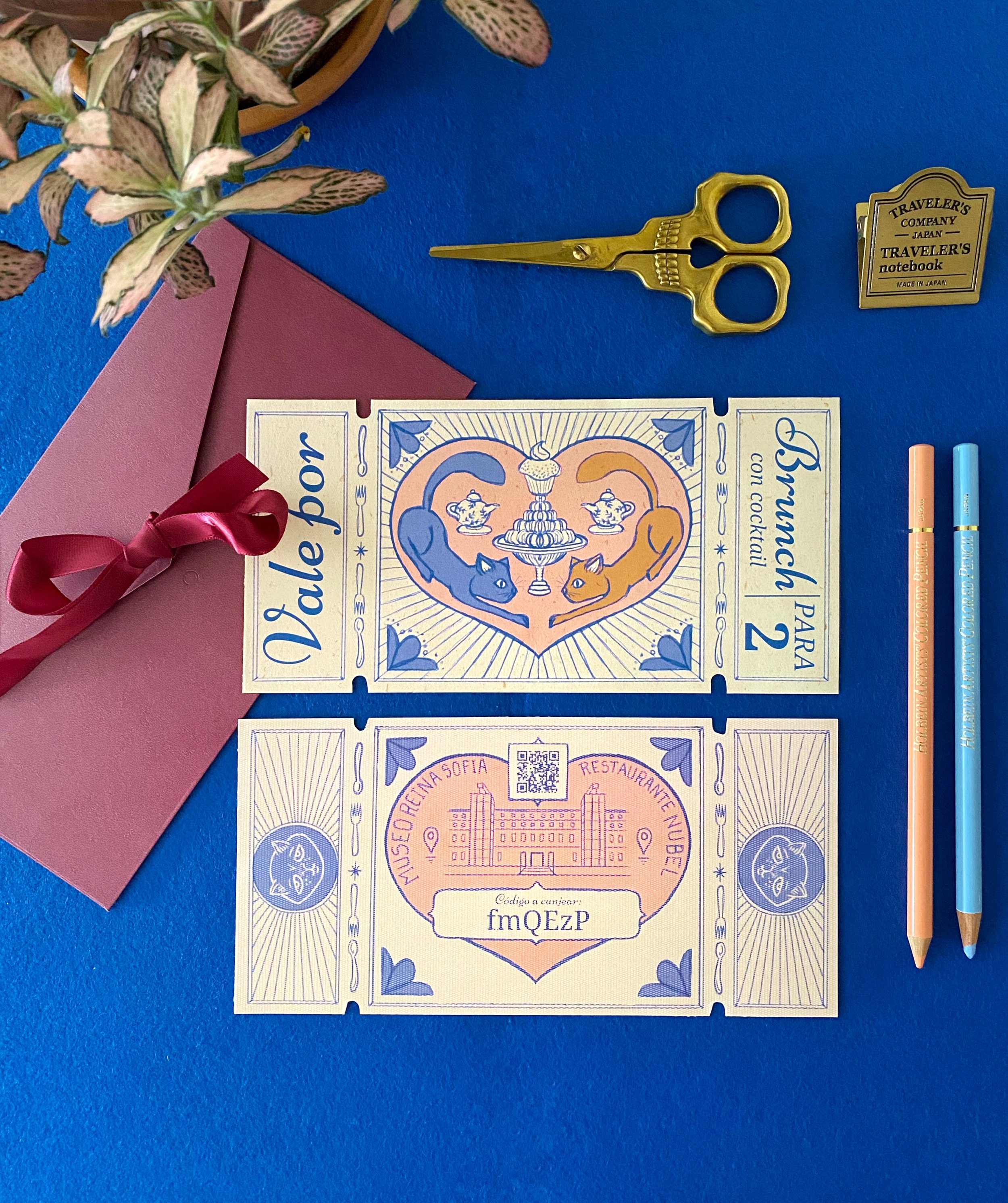 Ilustración y diseño de ticket regalo realizado como regalo personal para la boda de dos amigos. Con el detalle de incluir a sus dos gatos y la imagen del edificio del Museo Reina Sofia de Madrid, ya que el restaurante donde se ofrece el brunch es el Nubel, restaurante del Reina Sofia.